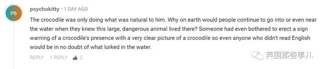 “鳄鱼做这些事是自然的行为。为什么知道水里有这种大型危险动物后,人们还要靠近那里呢?明明都有人举了牌子,用图画清楚写着附近有鳄鱼,哪怕是不懂英语的人都能看懂吧。”