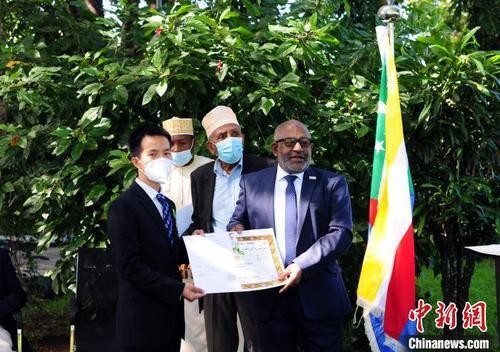 中新网南宁6月15日电(记者 黄艳梅)广西壮族自治区卫生健康委员会15日介绍,中国援科摩罗短期抗疫医疗队即将结束为期3个月的国际抗疫合作医疗工作。15日,科摩罗总统阿扎利向12名来自广西的中国援科摩罗短期抗疫医疗队队员颁授科摩罗最高荣誉勋章——“科摩罗绿新月骑士勋章”,并亲笔签发荣誉证书。
