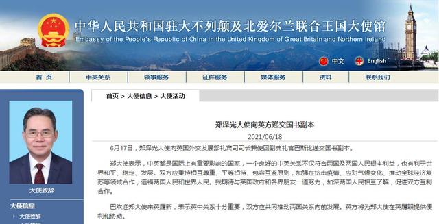 据中国驻英国大使馆网站6月18日消息,6月17日,郑泽光大使向英国外交发展部礼宾司司长兼使团副典礼官巴斯比递交国书副本。