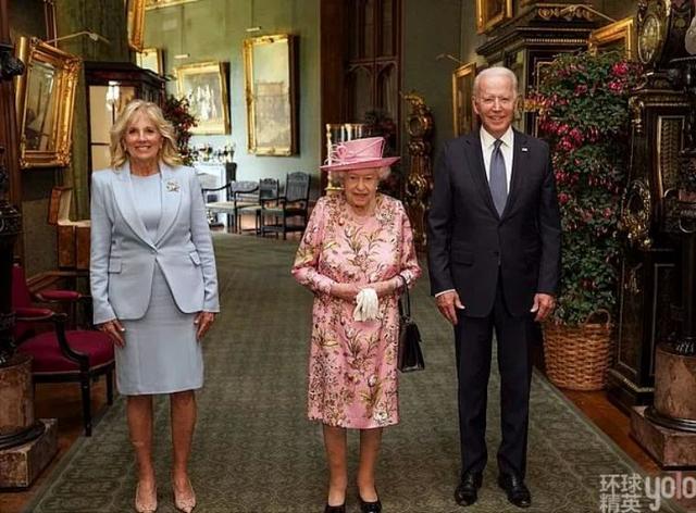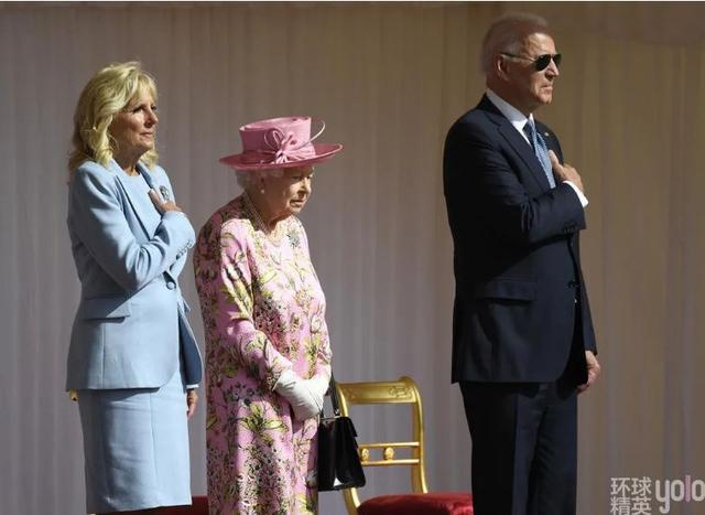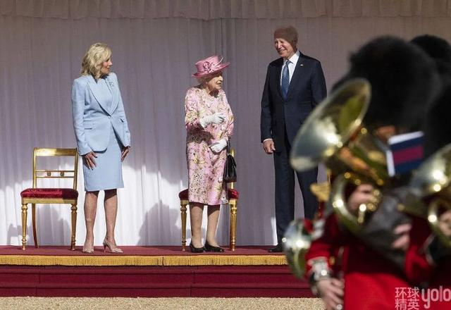 拜登夫妇二人和女王站在一起检阅了仪仗队,一起观看了阅兵式,随后三人一同进入温莎城堡,在女王的带领下,拜登夫妇参观了近1000年历史的温莎城堡,还愉快地喝了下午茶。