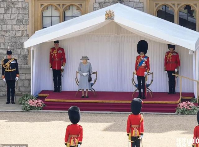 卫兵和骑兵在遵守社交距离的情况下,从女王面前缓缓走过。卫兵走过的时候,女王还开心地用脚打节拍。