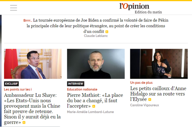 2021年6月15日,卢沙野大使接受法国《言论报》专访,就中国共产党建党百年、疫情、“战狼外交”、中美关系、中欧关系、涉疆、涉台等问题回答了记者提问。采访实录如下: