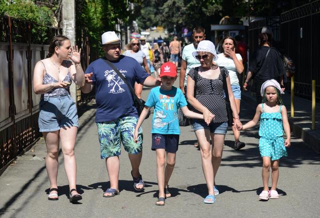 6月17日,人们在俄罗斯索契街头享受夏日阳光。