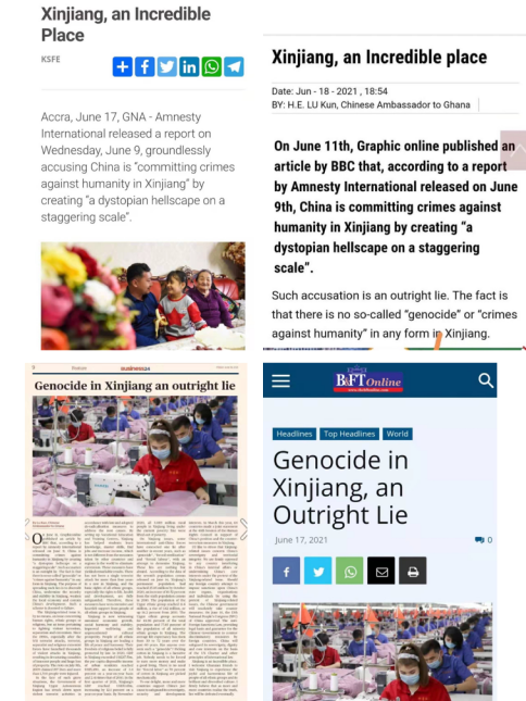 加纳主流媒体《每日写真报》的网站于6月11日援引BBC的一篇报道,诬称中国在新疆犯下“反人类罪”。面对这样一个彻头彻尾的谎言,中国驻加纳大使卢坤于6月16日-19日连续四天在加纳各大主流媒体及其网站发表署名文章《新疆是个好地方》,介绍新疆经济社会发展成就,驳斥“种族灭绝”、“强迫劳动”等谣言,揭露西方媒体散布谣言的目的是诋毁抹黑中国,破坏新疆安全稳定,削弱当地经济,遏制中国发展。