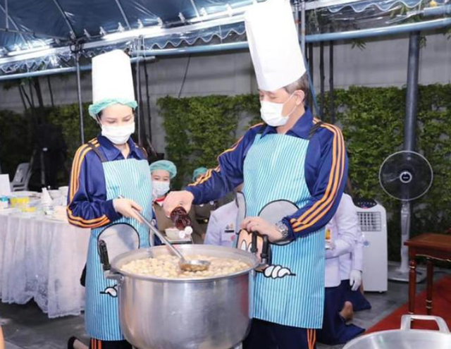 泰王出院的第三次公务活动,牵手诗妮娜一同出席慈善,两人身穿情侣装,泰王玛哈穿着拖鞋露着脚指头无比惬意潇洒,在煮饭的过程中诗妮娜娇羞卖萌哄得泰王团团转,并且亲自喂泰王吃东西。