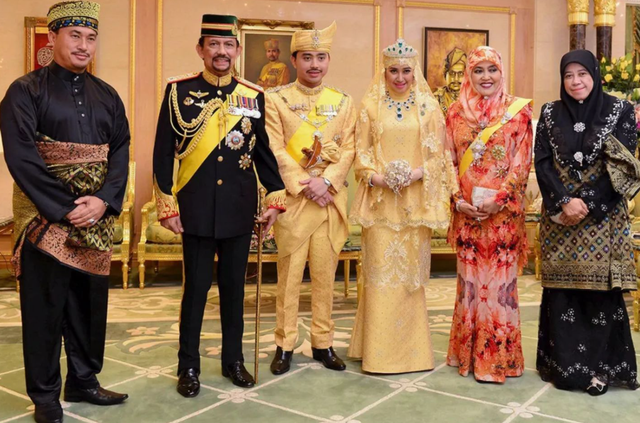 王妃在这场婚礼上,一共换了三套衣服,每套衣服搭配的王冠,首饰都不一样,真是羡煞旁人。和欧洲国家偏爱钻石不同,文莱王室就是喜欢金子,不知道是不是因为这样才能符合他们的身份呢?