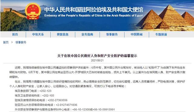 (原标题:陆续有中国公民在埃及遭盗抢,中国驻埃及大使馆提醒做好安全防护)