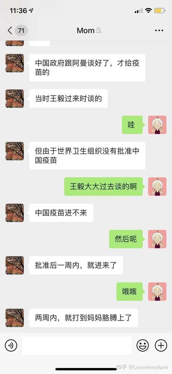 刚跟我母亲聊天,她跟我说她打完疫苗了,是中国政府送来的。