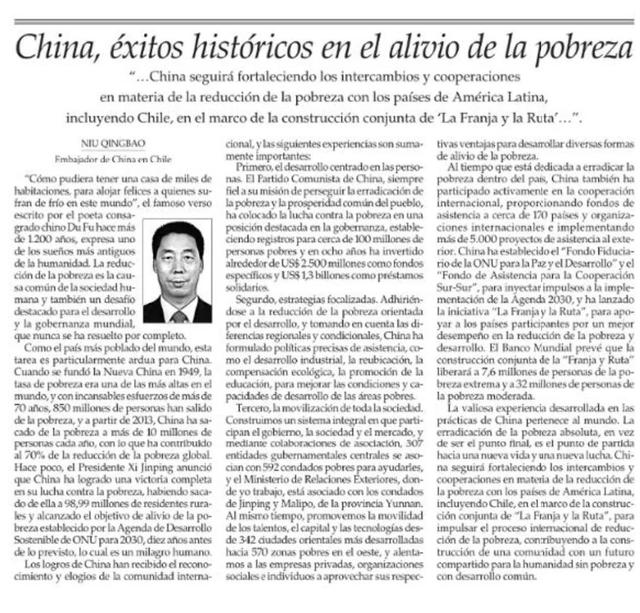 “安得广厦千万间,大庇天下寒士俱欢颜”,中国诗圣杜甫1200多年前写下的名句,道出了人类亘古以来的美好梦想。减贫是人类社会的共同事业,也是全球发展和治理的突出挑战,一直得不到根本解决。对于世界第一人口大国和最大发展中国家中国而言,减贫任务尤为艰巨。1949年新中国成立时,是世界贫困率最高的国家之一。经过70多年不懈奋斗,中国成功实现8.5亿人脱贫,2013年起每年减贫1000万人以上,对世界减贫贡献率超过70%。前不久,习近平主席宣布中国脱贫攻坚战取得全面胜利,现行标准下9899万农村贫困人口全部脱贫,提前10年实现《联合国2030年可持续发展议程》减贫目标,创造了又一个人间奇迹。中国减贫成就赢得国际社会广泛赞誉。联合国秘书长古特雷斯致信习近平主席,表示中国取得的非凡成就为整个国际社会带来了希望,这一成就证明中国创新驱动、绿色、开放的发展模式是重大机遇,将为所有人带来福祉。中国减贫成绩来之不易,有几点经验尤为重要:一是坚持以人民为中心。中国共产党始终把消除贫困、改善民生、实现共同富裕作为执政重要使命,将脱贫攻坚摆在治国理政突出位置,为近1亿贫困人口建档立卡,8年时间投入专项扶贫资金约合2500亿美元,发放精准扶贫贷款约合1.3万亿美元。二是坚持精准扶贫方略。中国坚持开放式扶贫,把发展作为解决贫困根本途径,针对不同地区、不同条件扶贫对象,给予产业发展、异地搬迁、生态补偿、促进教育、职业培训等精准帮扶政策,改善贫困地区发展条件,增强发展能力,实现由“输血式”向“造血式”帮扶转变。三是坚持全社会齐动员。构建政府、社会、市场共同参与的大扶贫体系。开展结对扶贫协作,307家中央单位定点帮扶592个贫困县,我所工作的外交部定点帮扶云南的金平县和麻栗坡县。同时,引导342个东部较发达省市的人才、资金、技术向570个西部贫困地区流动,鼓励民营企业、社会组织、个人发挥各自优势,开展产业、就业、公益、智力等多种形式扶贫。中国致力于消除自身贫困的同时,积极参与国际减贫合作,向近170个国家和国际组织提供援助资金,实施各类援外项目5000多个。中国设立“中国—联合国和平与发展基金”和“南南合作援助基金”,为落实联合国2030年可持续发展议程注入中国力量。中国发起共建“一带一路”倡议,支持参与国更好实现减贫发展。世行预测,共建“一带一路”将帮助760万人摆脱极端贫困,3200万人摆脱中度贫困。中国减贫实践形成的宝贵经验,既属于中国也属于世界。脱贫不是终点,而是新生活、新奋斗的起点。中方将继续在共建“一带一路”框架下,同包括智利在内的拉美各国加强减贫交流合作,携手推进国际减贫进程,为构建没有贫困、共同发展的人类命运共同体作出更大贡献。