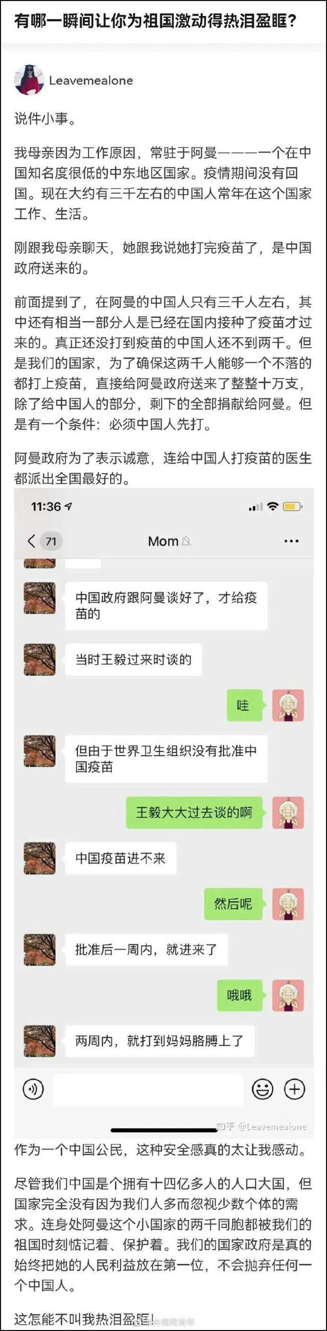 6月20日,有网友分享了母亲在阿曼接种中国疫苗的故事,动情地说:“我们的国家政府是真的把她的人民利益放在第一位,不会抛弃任何一个中国人。”