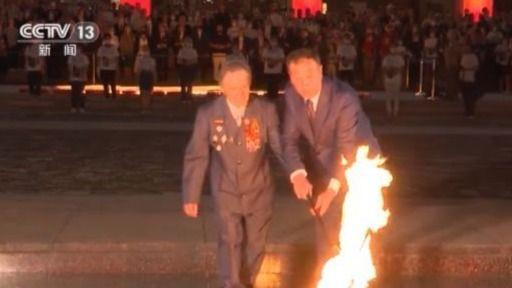 卫国战争老兵代表和博物馆负责人将象征着烈士精神的长明火炬的火种转移到蜡烛上,并传递给在场民众。