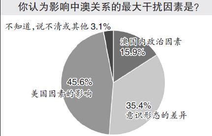 被问及是否同意“澳大利亚在经济上过于依赖中国”时,近一半中国受访者(49.6%)表示“同意”,27.2%“不同意”。当被问及是否同意“中国在经济上过于依赖澳大利亚”时,受访者中有11.5%表示“同意”,76.9%“不同意”。