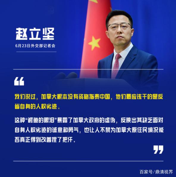 赵立坚表示,加拿大原住民学校发现数百名儿童遗骸,尽管加政府表示心碎,但却指望教会承担责任,这种“鳄鱼的眼泪”揭露了加政府的可耻和虚伪。加方根本没资格指责中国,他们最应该反省自身的人权劣迹。中方请问,加方何时开始对该事件展开调查?补偿又何时落实?针对种族歧视的措施何时出台呢?