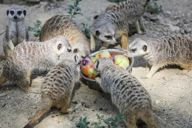 ↑6月23日,克罗地亚萨格勒布动物园的猫鼬享用冰冻水果,消夏降温。