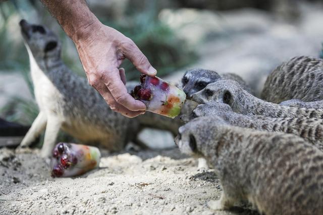 ↑6月23日,克罗地亚萨格勒布动物园的饲养员给园中的猫鼬喂食冰冻水果,消夏降温。