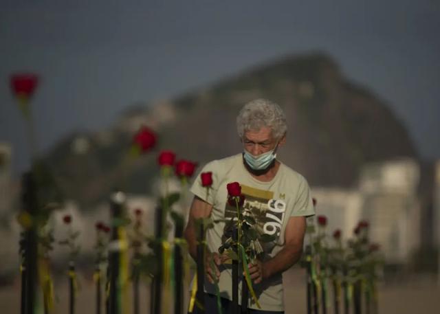 当地时间2021年6月20日,巴西里约,巴西新冠肺炎累计死亡病例突破50万,民众在科帕卡巴纳海滩上“种植玫瑰”,纪念新冠死难者。/IC photo