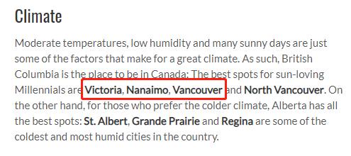 西岸的维多利亚市,纳奈莫,温哥华位居前三。
