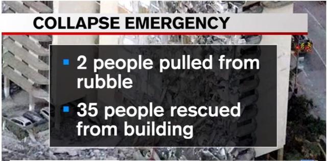 迈阿密-戴德消防和救援中心的 Raide Jadallah称已经救出了35人,而救援中心正在架设支撑结构,防止临近还未倒塌部分突然坍塌!他介绍称这栋楼的记录是几乎住满了人,但有很多人是来度假的,记录并非实时,因此当局到现在也还没搞清到底有多少人埋在瓦砾堆下!