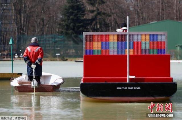 资料图:当地时间4月19日,法国一家船舶修理公司在河面上打造了一段迷你航道,训练水手们如何驾驶货轮通过这些较为狭窄的河段,以保证未来这些水手成为船长后能顺利通过苏伊士运河。