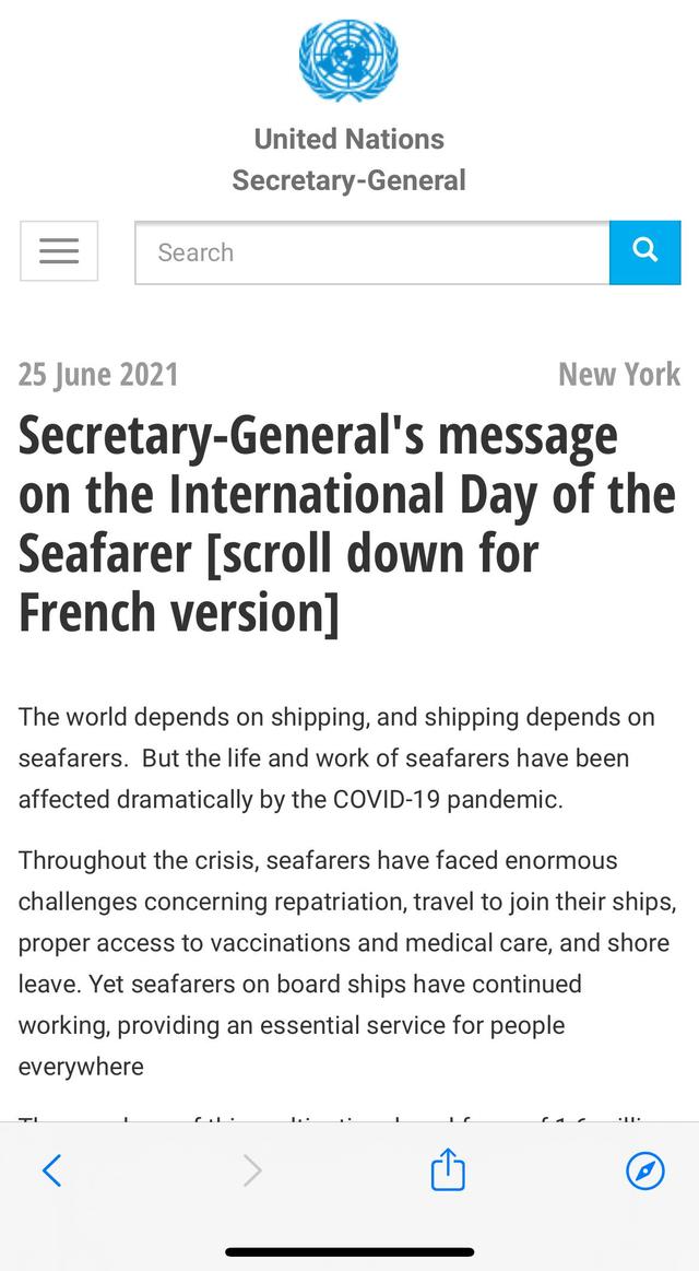 值此“世界海员日”来临之际,我们必须承认,世界贸易的未来取决于船舶操作人员。所有利益攸关方必须共同努力,确保海员有一个公平的未来。”