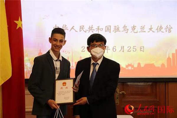 人民网基辅6月25日电 (记者谭武军)中国驻乌克兰大使馆25日举办“我眼中的中国”征文比赛颁奖仪式,中国驻乌克兰大使范先荣为获奖代表颁奖。其他获奖人员通过视频连线方式参加。此次征文比赛共有包括学生、教师、商人、政党、媒体的260多人参加,覆盖乌全境,代表性广。选手年龄最小的11岁,最大的67岁。