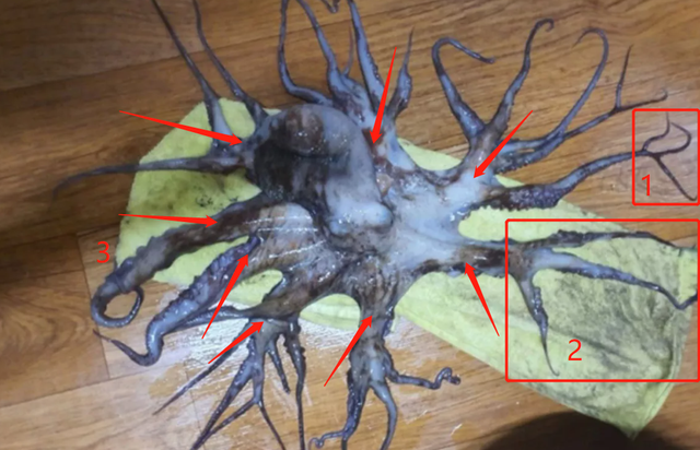 换句话说,连接主体的上臂(根部)并没有多,只有8根,所以它大概率是八足目——章鱼。渔民凭多年捕鱼经验,第一看见也认为是“章鱼”。不过,还有可能像研究人员所说,或许是未知物种,DNA活检之后就可以揭晓。