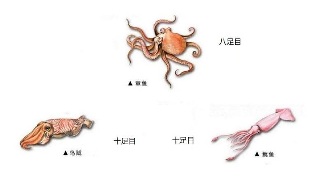 乌贼属于十足目,有十条腿,其中有两条是触手。鱿鱼属于十足目,鱿鱼的腿和乌贼一样。鱿鱼体内有透明角质软内壳,而乌贼是整块硬质碳酸钙内壳;鱿鱼顶端有两个剑鳍,而乌贼则是分布在四周的周鳍。