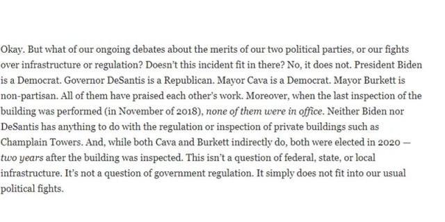 美媒的一篇评论则立场“守中持正”,认为:“这不是任何人的错。这不是拜登总统的错,不是佛州州长的错,不是迈阿密市长的错,大楼建成和审查的时候他们甚至都还没有上任,这也不是政府监管的问题。”