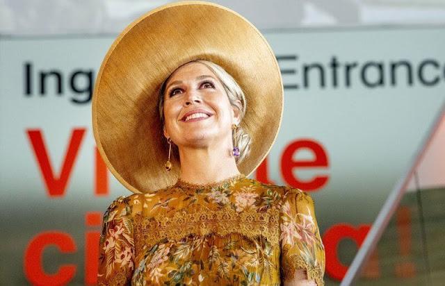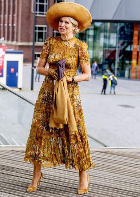 王后的这身造型确实是精心打扮的, 虽然在夏日里,印花裙是王室成员选择比较多的单品。但是像马克西玛王后这样的很有设计感的印花,却很少见。