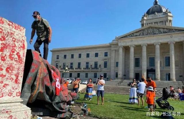 英国《卫报》指出,在加拿大马尼托巴议会大楼附近,一尊维多利亚女王的雕像被推倒。抗议者在雕像上涂上红色的手印,并留下一块写着“我们曾经是孩子。带他们回家”的标语。此外,示威者们还推翻了伊丽莎白二世女王的较小雕像。加拿大广播公司(CBC)报道称,一名男子被警方当场逮捕。