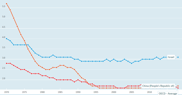 不过,也有一个国家的生育率走出了这个“逻辑悖论”,即伴随着收入增加,生育率也未有大幅度下降,甚至还有小幅增加,它就是以色列。