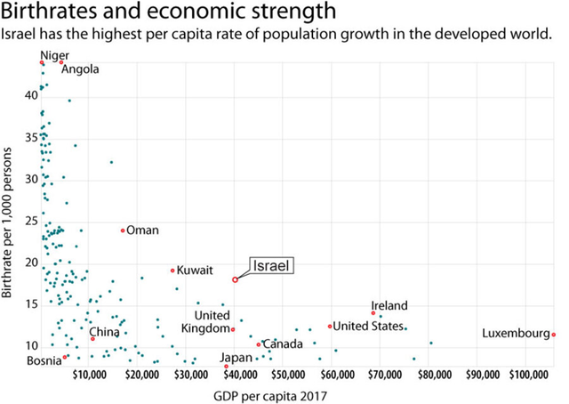 上图是2017年世界各国生育率和人均GDP的对比,横纵代表人均GDP,纵轴代表每千人出生率。在所有人均GDP超过4万美元的国家中,只有以色列的每千人出生率为18人。加拿大仅为11人,美国为13人,卢森堡为12人。