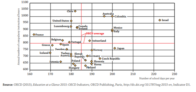以色列是发达国家中,唯一一个每周上学六天的国家。1953年制定的《国家教育法》,就规定了每周为期六天的学制,该法同时还允许“教育部长在75%的家长要求下,批准额外的机构课程,最多占现有课程的25%,或由地方当局或家长资助的额外课程。”换句话说,如果家长觉得还需要增加学生的知识,有超过75%家长的要求,学校就得开课。统计数据显示,在2015年OECD国家小学生在校天数为185天,而以色列为222天。