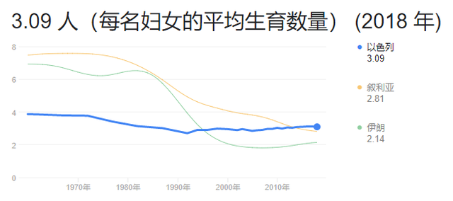 以色列的出生率不仅在发达国家中独树一帜,即便与其相邻国家相比,也毫不逊色。如下图所示,2018年以色列的总和生育率是3.09,而它的邻居叙利亚和伊朗在2018年的总和生育率分别是2.14和2.81。从上世纪50年代以来,以色列的总和生育率也一直在下降,但也只是从将近4下降到2018年的3.09,而同期的叙利亚和伊朗则是从超过7下降到2.81和2.14。