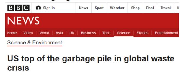 美国是世界第一垃圾制造国,人均垃圾产量是中国的三倍,是全球唯一一个垃圾产量远高于回收量的发达国家;