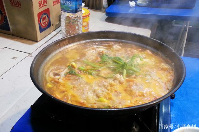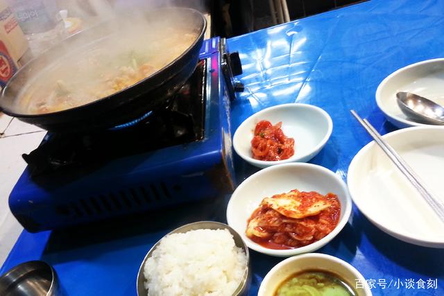 一个大锅炖上一点菜,里面放着豆芽之类的,看起来有点像东北一锅炖,不过我们的东北一锅炖,好歹还有大块的肉可以吃,韩国普通民众吃的这一锅炖,倒是看不出来有什么特色的菜,都是一些很常见的食材,另外配上一点大米饭,还会来上一小碟泡菜,这个泡菜真的是韩国人民永远的爱。