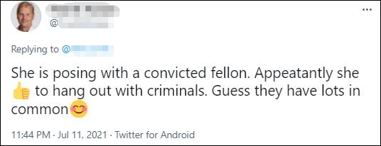 “她在和一个罪犯合影,我猜他们有很多共同之处,”另一名用户在推特上讽刺道。