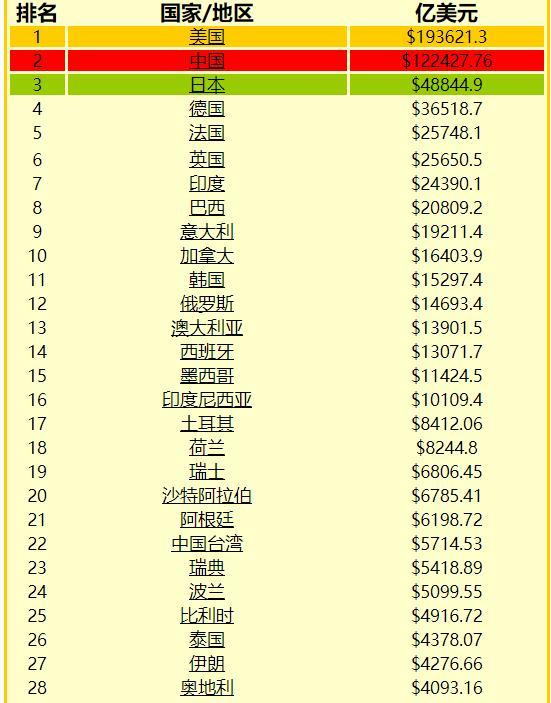 这一年,我国GDP为7.55万亿美元,占全球GDP的10.2797%,世界第二;巴西的GDP为2.62万亿美元,占全球GDP的3.5614%,世界第七;印度的GDP为1.82万亿美元,占全球GDP的2.4817%,世界第十;俄罗斯的GDP为2.05万亿美元,占全球GDP的2.7851%,世界第九;南非的GDP为4164.19亿美元,占全球GDP的0.5669%,世界第二十八。