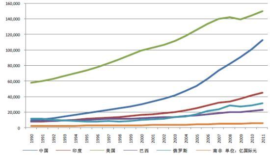 再看一下2011年的数据。之所以说这一年,因为在2008年美国发生了金融危机,这次危机影响到了全世界,整个世界都受这次危机的影响。不过作为新兴的经济体,金砖五国受这次金融危机的影响并不大。可以说这些国家不仅经济没有下降,反而持续上升,达到了一个巅峰。