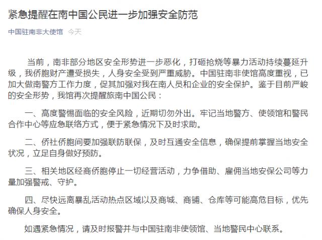 此前,中国大使馆还向在南非的同胞发布四点紧急提醒。