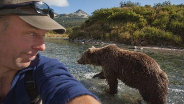 一名摄影师在美国阿拉斯加州卡特迈国家保护区与一只路过的棕熊自拍(盖帝图像)