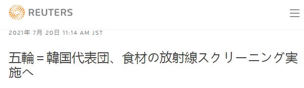 据路透社20日报道,韩国奥委会公关部门19日表示,为了让韩国选手避免食用东京奥运村提供的食品,东京奥运会韩国代表团工作人员将会专门烹调食品并提供给韩国选手。同时,在烹调之前,工作人员还会对食材进行放射性核辐射检测。