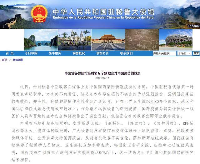 据环球网报道,秘鲁个别“反华”政客莫名其妙地突然在社交平台对来自中国的疫苗进行抹黑,对此,中国驻秘鲁大使馆第一时间表态,对这些不怀好意的政客进行了严厉的谴责。在中国大使馆发声后,秘鲁不少政要也在社交平台发声,表示秘鲁支持中国疫苗,同时非常反对个别政客的不当言论。秘鲁网友也纷纷力挺中国,痛骂个别政客。