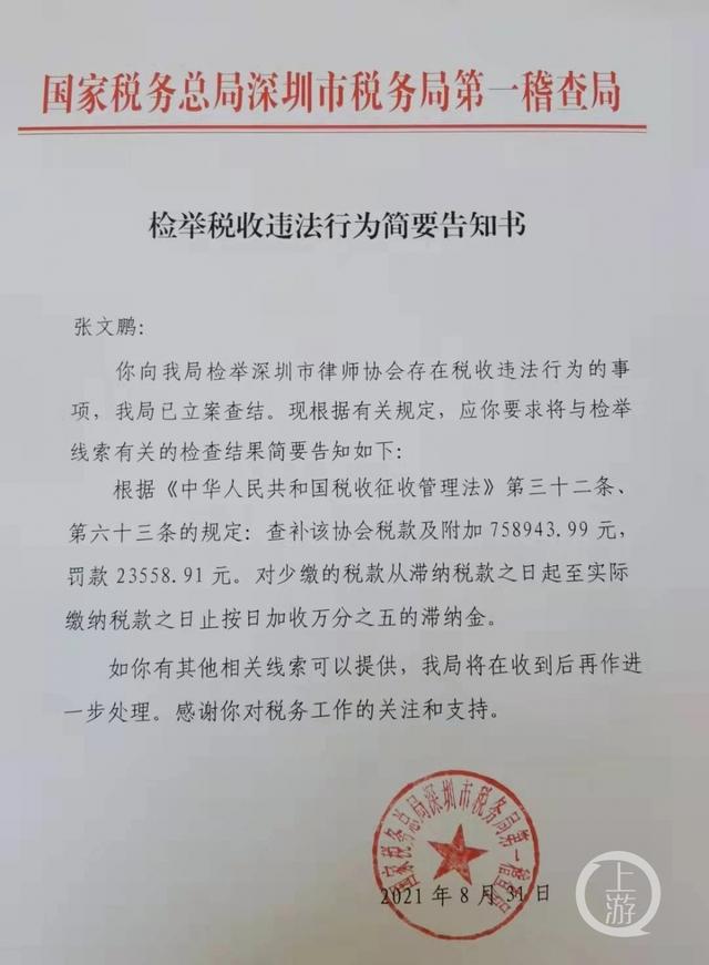 8月31日,国家税务总局深圳市税务局第一稽查局向张文鹏发送《检举税收违法行为简要告知书》,称张文鹏检举深圳律协存在税收违法行为的事项,已立案查结:查补该协会税款及附加758943.99元,罚款23558.91元。对少缴的税款从滞纳税款之日起至实际缴纳税款之日止按日加收万分之五的滞纳金。