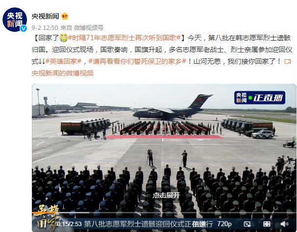今天,第八批在韩志愿军烈士遗骸归国。迎回仪式现场,国歌奏响,国旗升起,多名志愿军老战士、烈士亲属参加迎回仪式 英雄回家,#请再看看你们誓死保卫的家乡#!山河无恙,我们接你回家了!