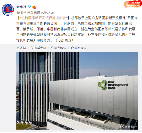 【#金砖国家新开发银行首次扩容#】总部位于上海的金砖国家新开发银行2日正式宣布将迎来三个新的成员国——阿联酋、乌拉圭和孟加拉国。新开发银行由巴西、俄罗斯、印度、中国和南非共同成立,旨在为金砖国家等新兴经济体和发展中国家的基础设施和可持续发展项目调动资源,补充多边和区域金融机构为全球增长和发展所做的努力。