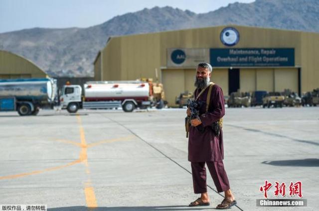 当地时间8月31日,美军所有部队撤离阿富汗后,在喀布尔机场,一名塔利班成员在阿富汗空军飞机附近站岗。