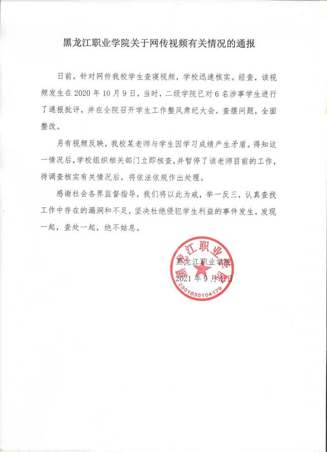 (原标题:黑龙江职业学院回应嚣张查寝视频:事发去年,6人被通报批评)