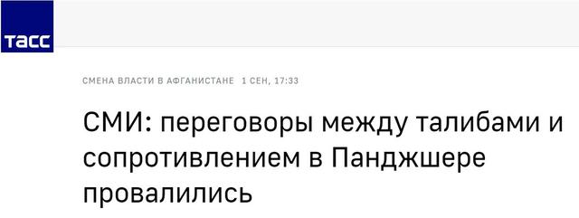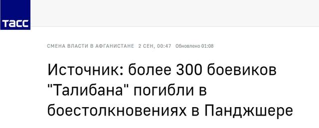 一名消息人士9月1日向塔斯社透露,“在塔利班试图开展从两个方向攻入潘杰希尔的行动后,(双方)昨天夜里开始交战,造成超过300名塔利班士兵死亡,另有数十名塔利班士兵受重伤或被俘”。这名消息人士还说,通往潘杰希尔地区的入口处的交战仍在继续,“塔利班未能成功突破防线,他们如今不得不撤退”。