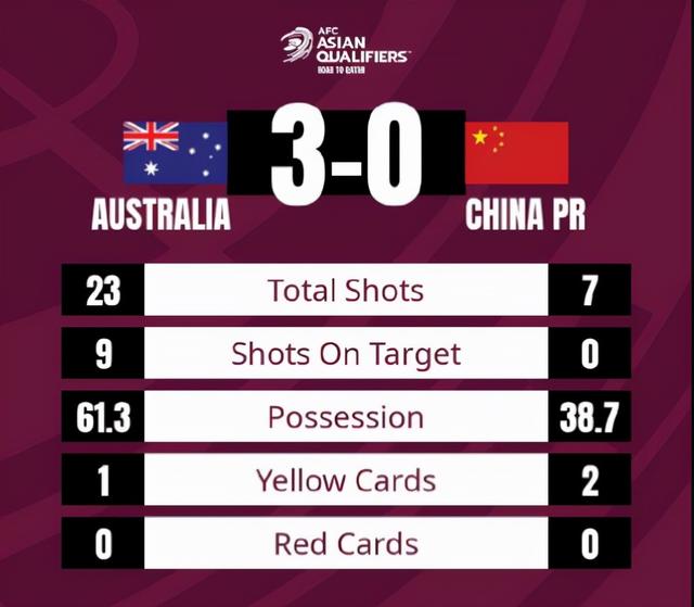 赛后数据统计显示,国足全场7次0中,而澳大利亚是23射9中,控球率38.7%-61.3%,双方差距太大。